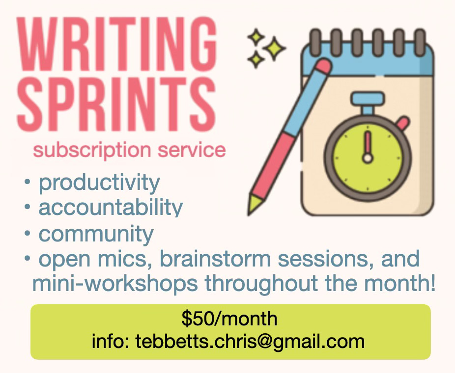 If you need accountability, this is more than a zoom room. Chris and I offer regular discussions, brainstorms, virtual retreats, and open mics. It has made a big difference for me.